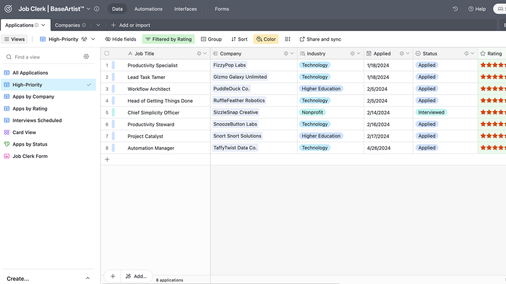 Job Clerk is a sleek, ready-to-use Airtable base crafted for creatives and solopreneurs to log, track, and manage job applications with clarity and purpose. Say goodbye to scattered notes, forgotten follow-ups, and missed opportunities. With Job Clerk, you get a centralized hub to organize applications, monitor statuses, and link companies seamlessly—all through prebuilt views that require no setup. Designed for quick onboarding, it empowers busy freelancers and artists to prioritize what matters most, aligning your job search with your career goals from day one.